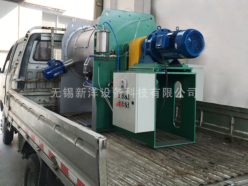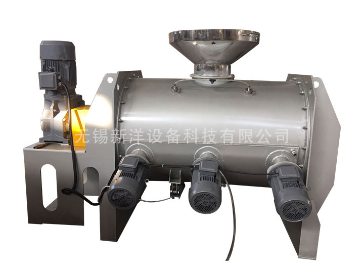 犁刀混合機,由主軸減速機帶動犁刀組軸運動,一部分將物料沿筒體圓周作徑向運動,同時將物料沿犁刀兩側的法線方向拋出,另一部分被拋出物料經飛刀組時,被高速旋轉的飛刀剪切攪拌而強烈也適合粘狀、稠狀、塊狀固—固(粉體與粉體)、固—漿(粉體與膠漿液)的物料或密度差異較大的物料也能混合。