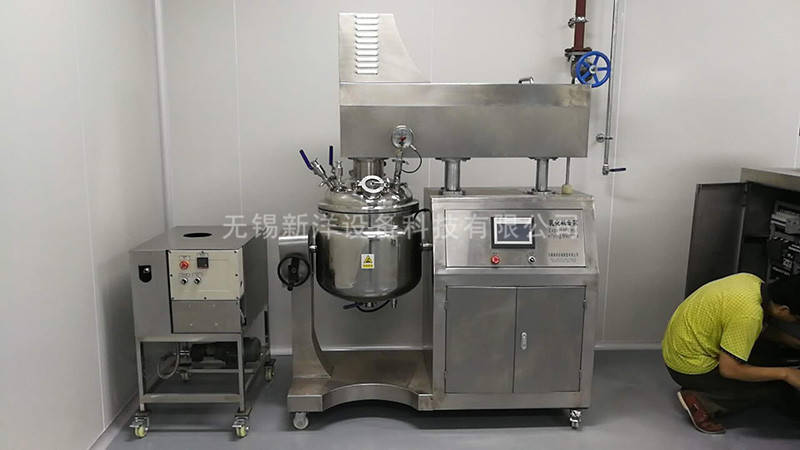 物料在水鍋、油鍋內(nèi)通過加熱、攪拌進(jìn)行混合反應(yīng)后,由真空泵吸入乳化鍋,通過乳化鍋內(nèi)上部的中心攪拌、聚四氟乙烯刮板始終迎合攪拌鍋形體,掃凈掛壁粘料,使被刮取的物料不斷產(chǎn)生新界面,再經(jīng)過葉片的剪斷、壓縮、折疊,使其攪拌、混合而向下流往鍋體下方的均質(zhì)器處,物料再通過高速旋轉(zhuǎn)的切割輪與固定的切割套之間所產(chǎn)生的強(qiáng)力的剪斷、沖擊、亂流等過程,物料在剪切縫中被切割,迅速破碎成200um-0.2um的微粒,由于乳化鍋內(nèi)處于真空狀態(tài),物料在攪拌過程中產(chǎn)生的氣泡被及時抽走。采用抽真空的方式,使所生產(chǎn)的制品在攪拌過程中不再混入氣泡,從而保證可制造出富有光澤、細(xì)膩及延展性良好的產(chǎn)品。