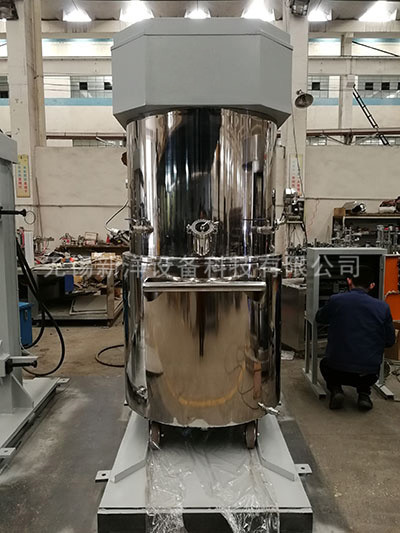 行星架轉動時,帶動箱內的三根攪拌、分散軸圍繞料桶軸線公轉的同時高速自轉,從而使物料受到強烈的剪切、捏合作用,達到充分分散和混合的目的;在行星架上有一刮壁刀隨行星架轉動,緊貼桶壁不斷的刮拭,使桶壁無滯留料,提高混合效果。攪拌時間的長短根據物料的屬性的不同由用戶掌握,可通過控制面板調節。封蓋及行星攪拌器由雙柱液壓升降,操作平隱、快捷、輕便。